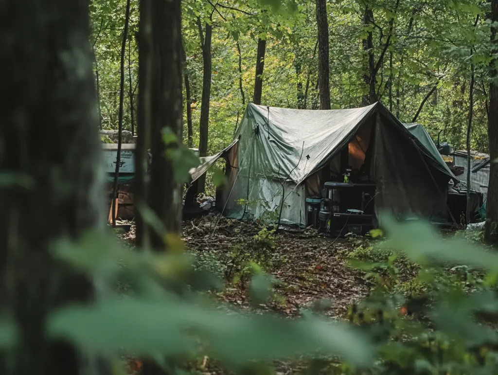 Οι χτύποι της καρδιάς της επιταχύνθηκαν. Μέσα από τα δέντρα μπροστά της, κάτι έσπασε τη μονοτονία του πράσινου, μια λάμψη καμβά, η βουβή λάμψη μετάλλου. Έσκυψε χαμηλά, κινούμενη ανάμεσα στους κορμούς, μέχρι που το ξέφωτο ήρθε στη θέα της.