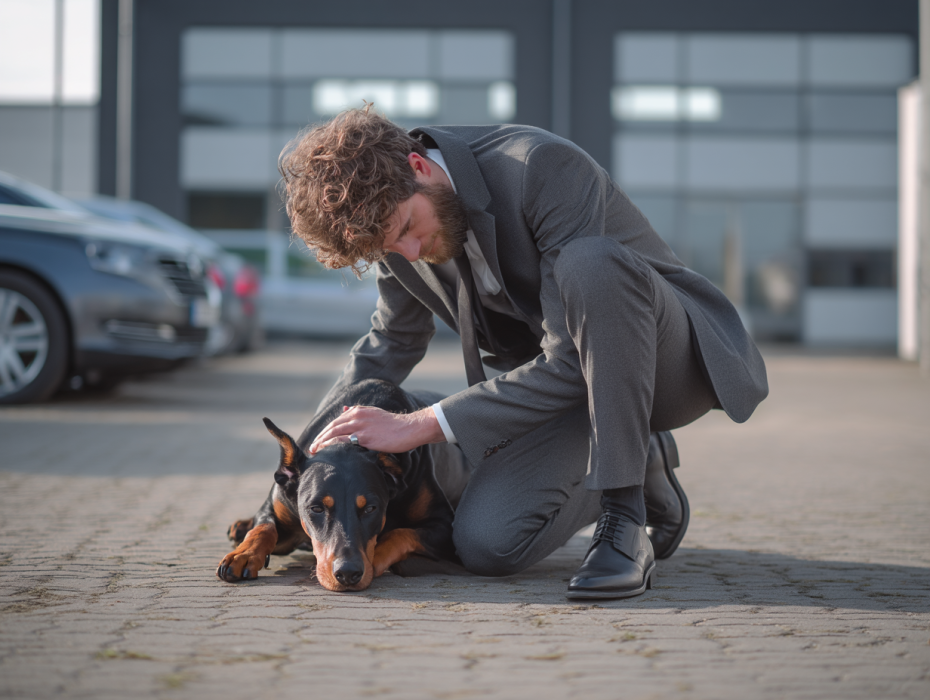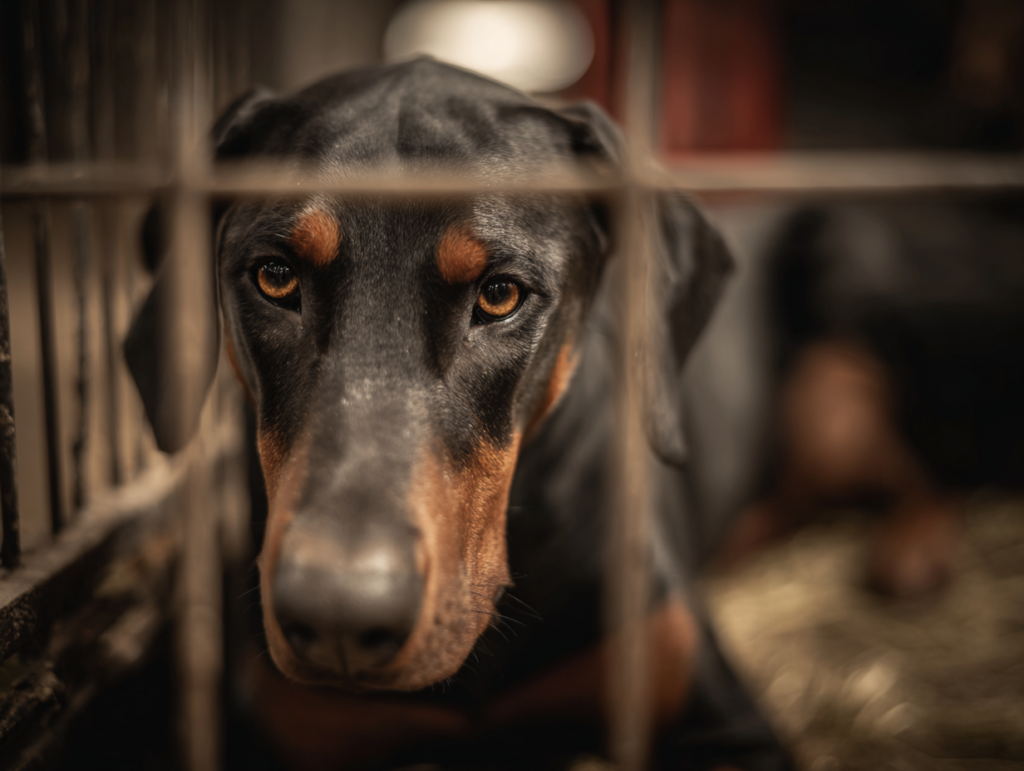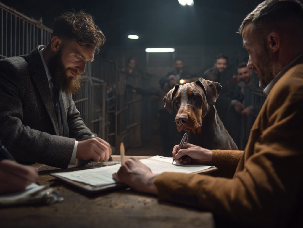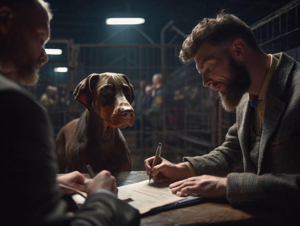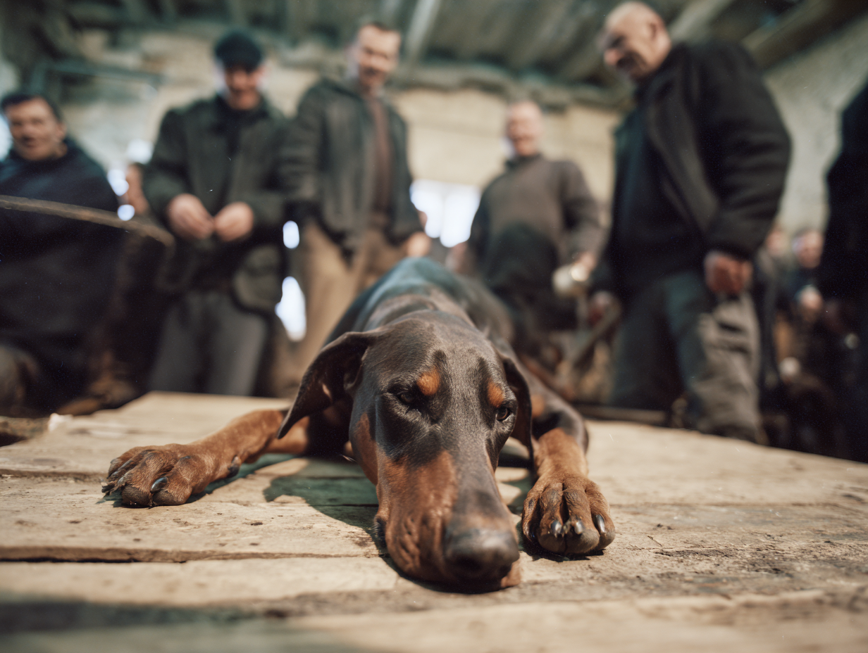 El dóberman fue conducido a la sala de subastas con la cabeza baja y el rabo recogido. El público esperaba una muestra de agresividad. En lugar de eso, sintieron miedo. Los murmullos se convirtieron en risas. Alguien dijo que el perro “parecía destrozado” Sam observó los ojos del perro: cansados, conscientes y nada vacíos.