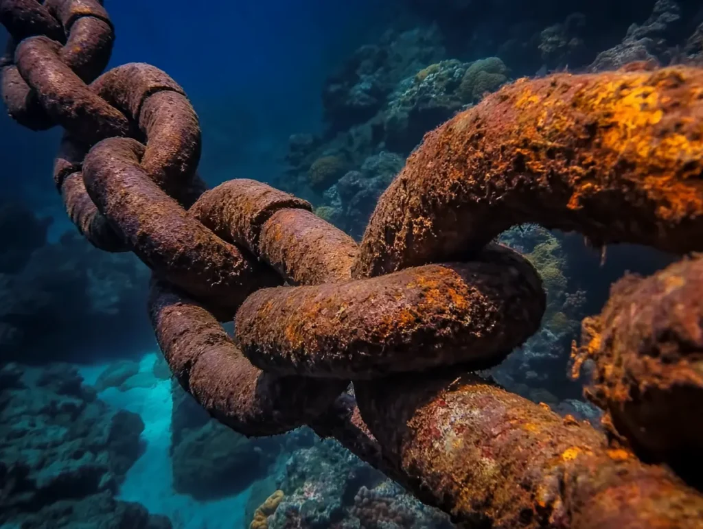 Ses maillons étaient recouverts de corail et d’algues, mais le métal qui se trouvait en dessous brillait encore aux endroits où le courant l’avait raclé. Edwin nagea à ses côtés, leurs lumières traversant la brume bleue. Les bancs de poissons se dispersaient à leur approche, scintillant d’un éclat argenté avant de disparaître à nouveau dans la pénombre.