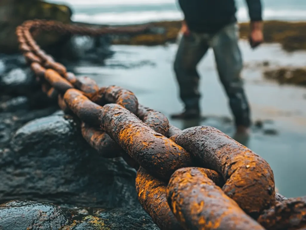 Il se pencha et l’enfonça avec son aviron. Le bois frappa le fer avec un bruit creux. Ce n’était pas de la roche. Pas du bois flotté. Quelque chose de fabriqué. Quelque chose de placé. De retour sur le rivage, la curiosité l’emporte sur la prudence. La chaîne serpentait le long de la plage en une ligne dentelée, à moitié enfouie dans le sable et les algues, avant de disparaître sous une crête basse. L’odeur du sel et de la rouille flottait dans l’air.