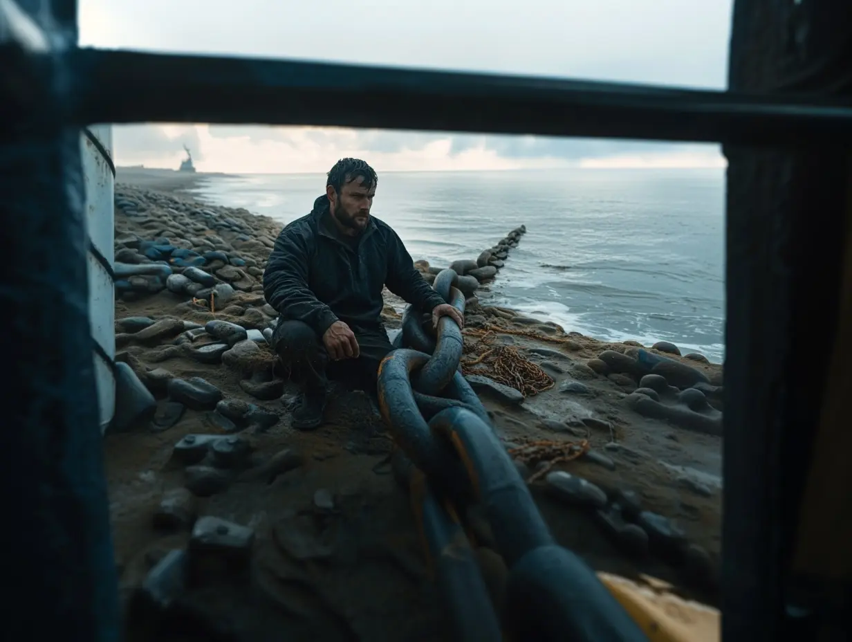 Il se pencha et l’enfonça avec son aviron. Le bois frappa le fer avec un bruit creux. Ce n’était pas de la roche. Pas du bois flotté. Quelque chose de fabriqué. Quelque chose de placé. De retour sur le rivage, la curiosité l’emporte sur la prudence. La chaîne serpentait le long de la plage en une ligne dentelée, à moitié enfouie dans le sable et les algues, avant de disparaître sous une crête basse. L’odeur du sel et de la rouille flottait dans l’air.
