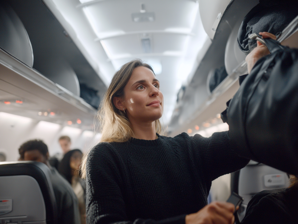 Around her, boarding continued. Overhead bins snapped shut. Someone laughed softly at a video. The young child squealed again several rows ahead, blissfully unaware. Around her, passengers slowly settled into their spots. A child kicked off their shoes. The cabin smelled faintly of coffee and fabric cleaner.