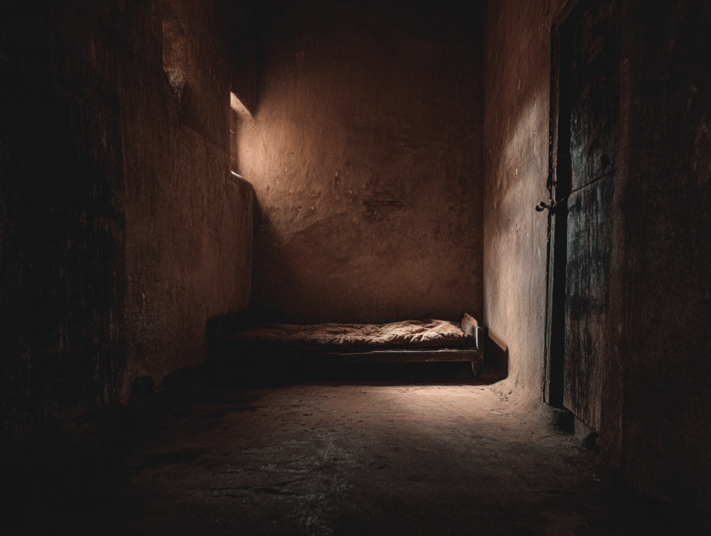 Si accovacciò e sbirciò all’interno. Le assi grezze formavano un soffitto basso; i mattoni nudi premevano ai lati. La stretta cuccetta correva per tutta la lunghezza di una parete, di fronte a una striscia di pavimento in cui lievi segni di abrasione attraversavano la polvere, come se i piedi vi si fossero mossi irrequieti molto tempo prima e il ricordo del movimento fosse rimasto