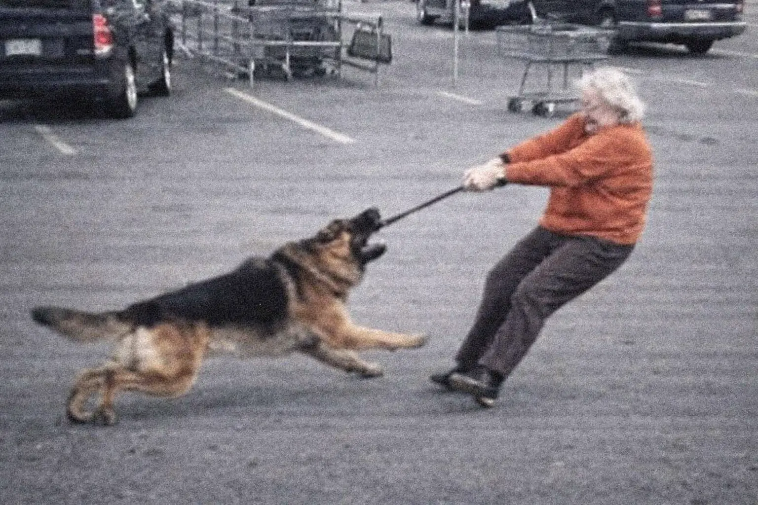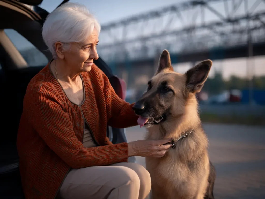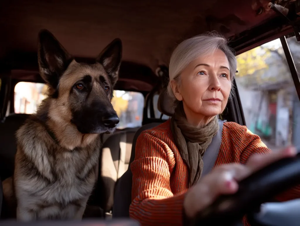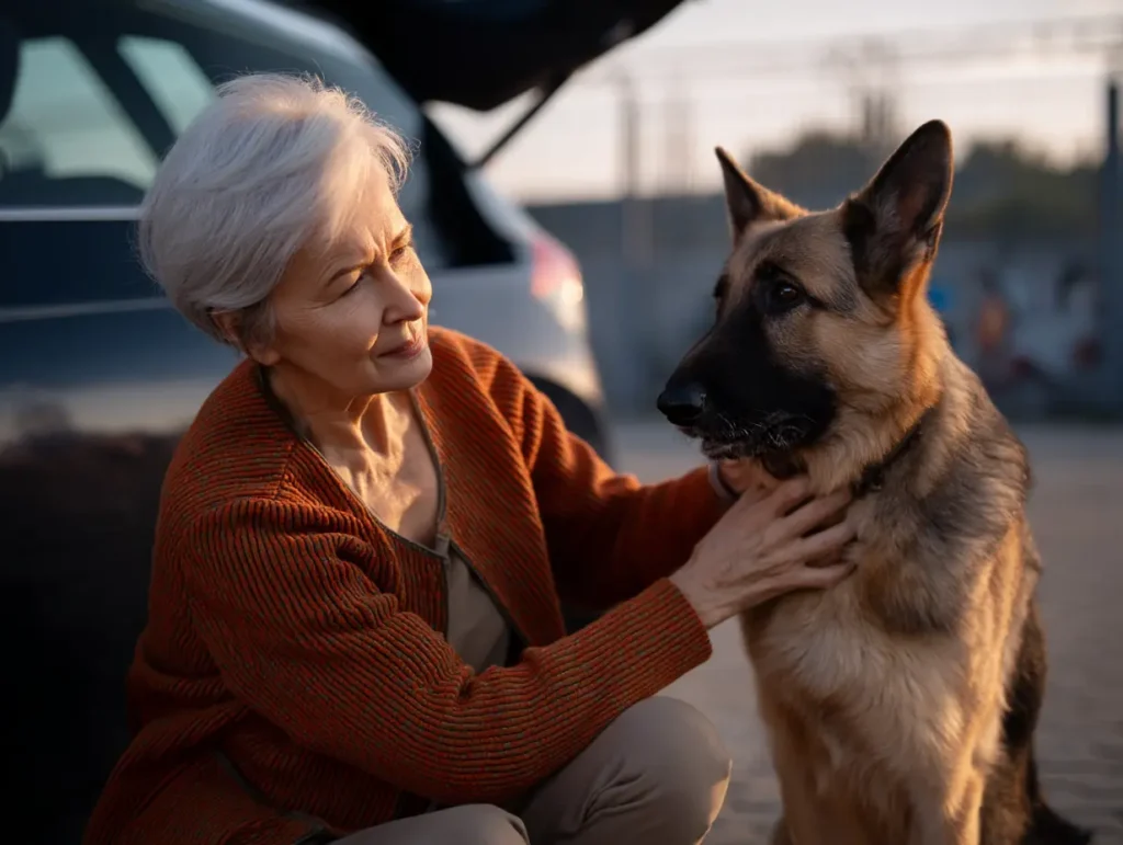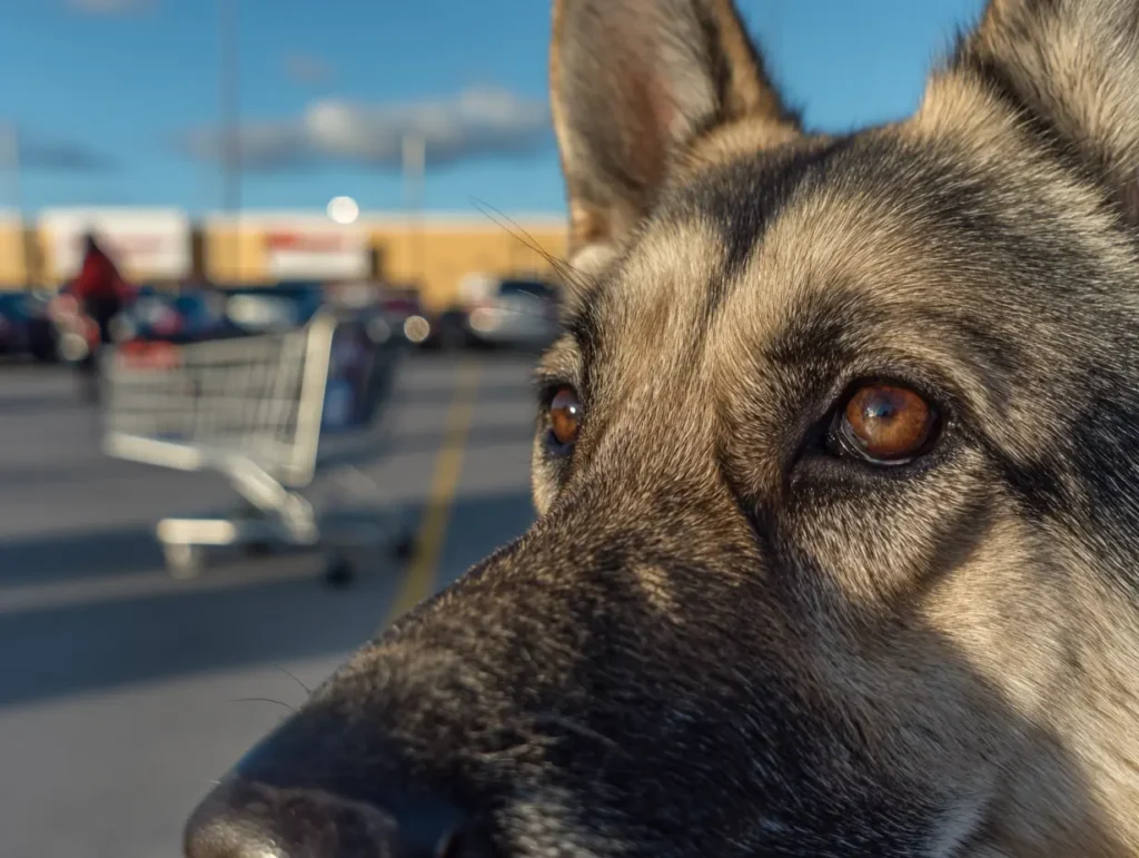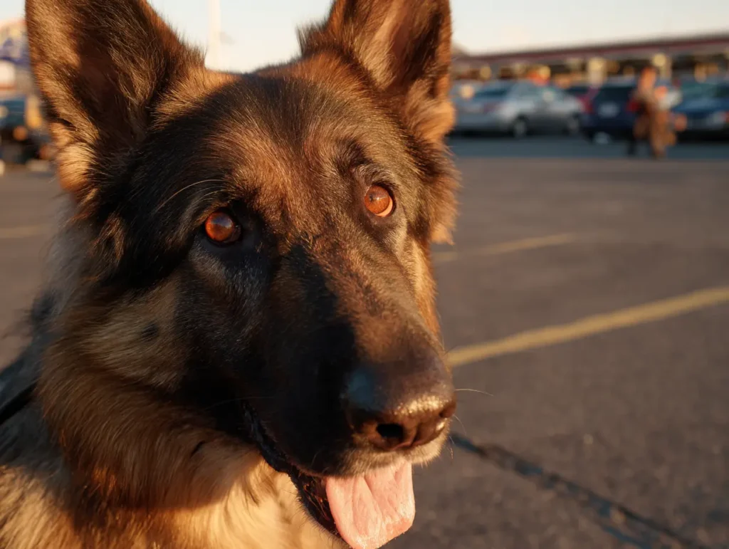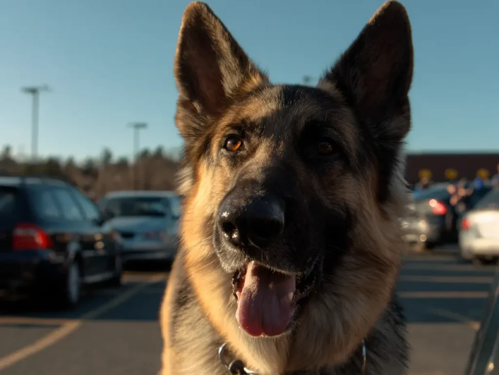 Eleanor draaide langzaam rondjes, op zoek naar wat hij had gevonden. Niets zag er verkeerd uit. Auto’s. Karren. Mensen die boodschappen inladen. En toch hield Rex stand, elke spier gespannen, alsof hij precies voor dit soort momenten getraind was. Eleanors vreugde koelde af tot iets kouder – een instinct dat ze in jaren niet had gevoeld: er komt iets aan.