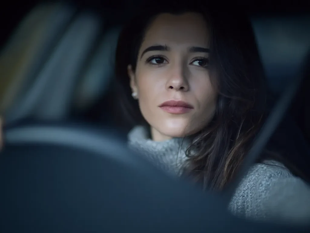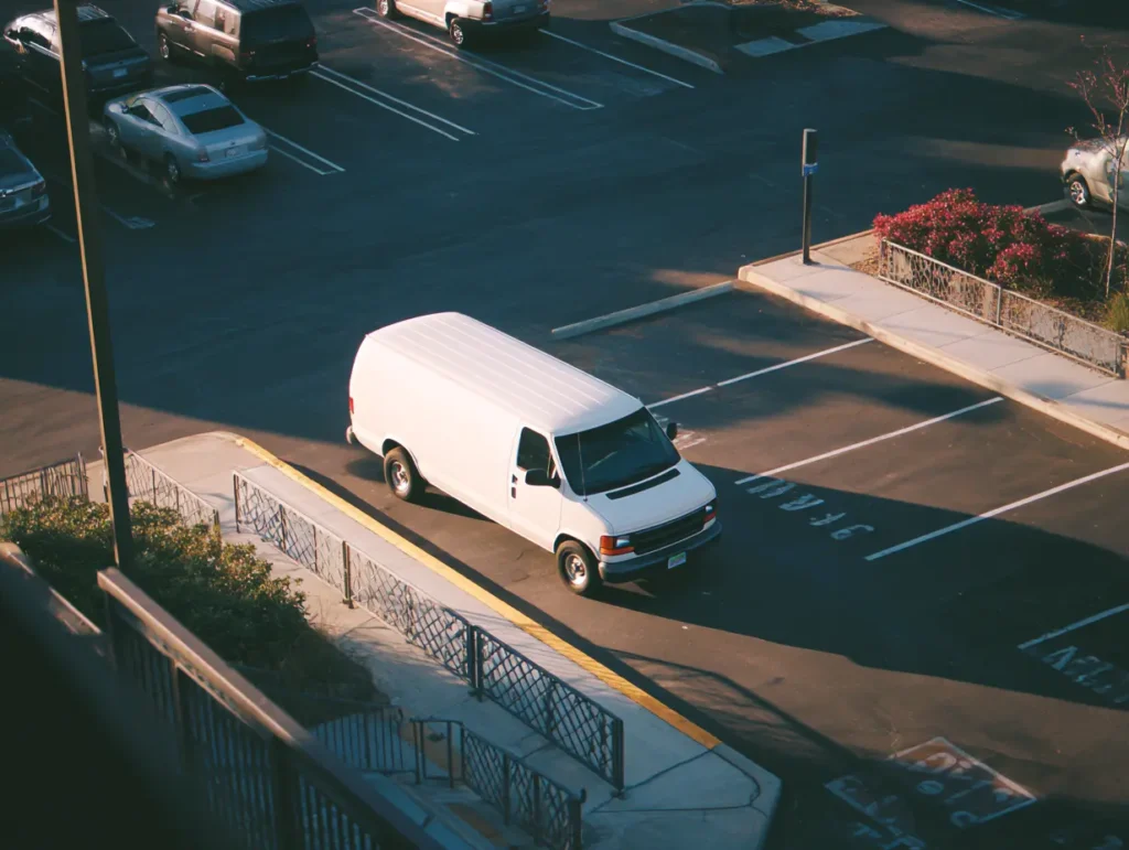 Haar handen waren stevig toen ze de motor startte. Ze keek in de achteruitkijkspiegel. Het busje bewoog niet. Ze schakelde in zijn achteruit. Het busje bleef stilstaan. Ze reed de ruimte uit. Toen ze naar de uitgang draaide, rolde het busje naar voren. Niet snel. Niet agressief. Net genoeg om te volgen. Haar kaak verstrakte. “Oké,” zei ze zachtjes, haar ogen gericht op de spiegel.