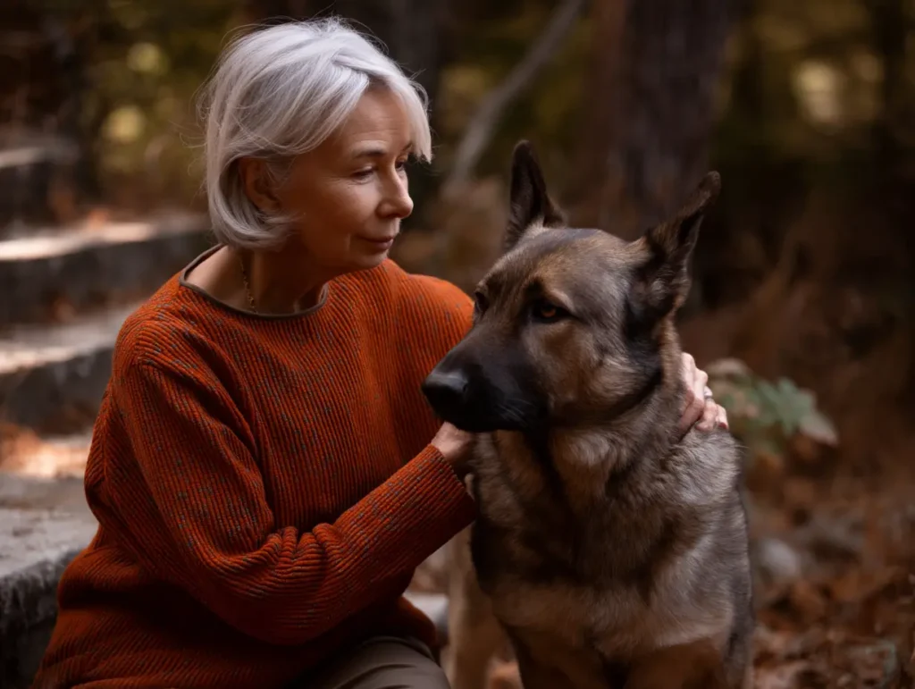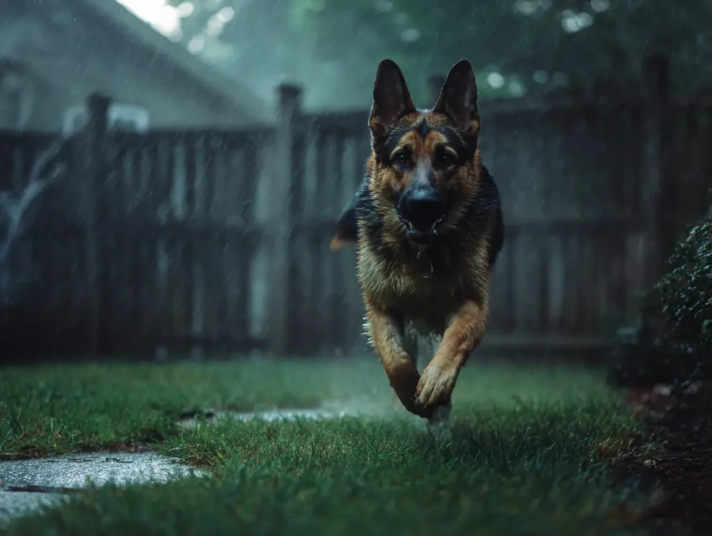 De wind verschoof achter haar. Ademhaling. Dichtbij. Haar hart sloeg over. Ze draaide zich om. Een Duitse herder stond vlak achter haar, stil, perfect in balans, oren naar voren, amberkleurige ogen gericht op de hare. Niet verwilderd. Niet verdwaald. Wachtend zoals hij getraind was om te wachten. Eleanors keel verstrakte toen details op hun plaats vielen: het zwarte zadel, de tan poten, de kleine inkeping in het rechteroor.