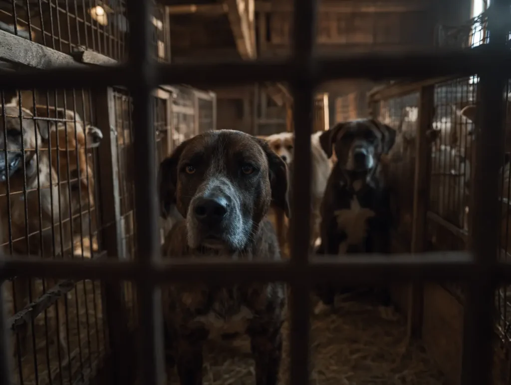 Eleanors maag zakte naar beneden. Kooien. Rijen vol. Honden opgesloten in gestapelde kratten, hangsloten, angstige gezichten tegen het draad gedrukt. En niet meer alleen twee mannen. Drie. Marcus. De gemaskerde man. Een andere figuur bewoog in het gangpad, controleerde de sloten, wees, telde.