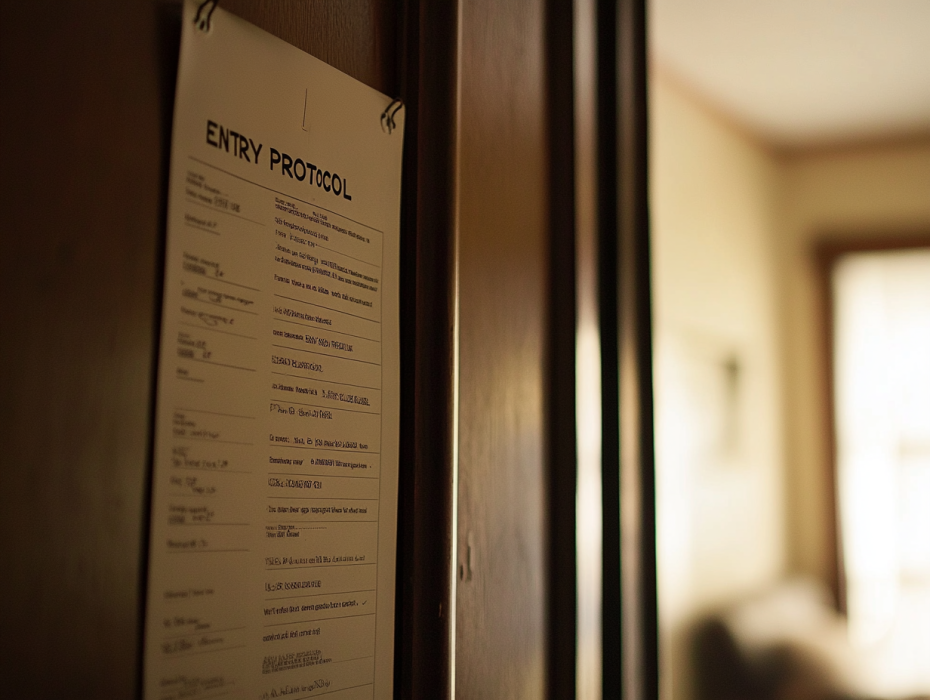 Het ENTRY PROTOCOL werd een gelamineerd blad bij de deur, pen aan een touwtje als een stemhokje. Ze leerde de stappen uit haar hoofd: Spray, schoenen, tas, douche. Hokjes om aan te kruisen, zelfs als ze alleen naar buiten ging om post te halen. “Het houdt buiten buiten,” zei hij weer, terwijl hij de lucht bij haar voorhoofd kuste, maar nooit helemaal landde.