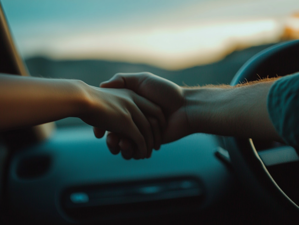 Terwijl de lichten van de stad zich voor haar verzamelden, reikte ze over de console en nam zijn hand – onbeschreven, ongemeten. Hij trok hem niet weg. Hij kneep terug, stil en verrast, alsof iemand zich voor het eerst realiseerde dat nabijheid kan gebeuren zonder checklist. Ze hield vast en liet niet meer los.