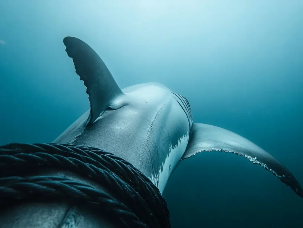 Marcus slowed his approach, every nerve in his body urging him to turn back, yet some deeper pull pushed him closer. The knife seemed pitifully small against the mass of muscle and teeth before him. He drifted nearer, the details sharpening with each kick — the coarse rope cutting into pale skin, the harpoon bolt embedded cruelly near the tail.