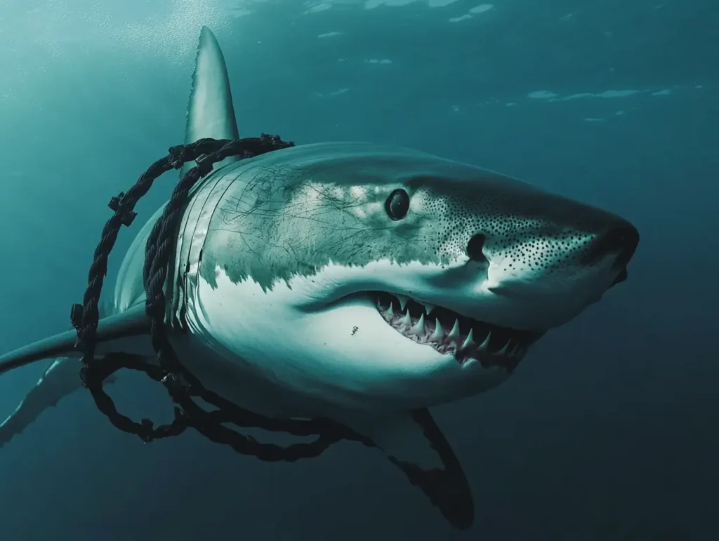 The shark’s eye flickered as he approached, rolling slightly toward him, black and bottomless. Marcus steadied his breathing, forcing calm into his movements. He circled cautiously, keeping distance from the gaping jaws. The rope was wound tight, coiled cruelly across the body. He pressed closer, feeling his heartbeat hammer in his throat.