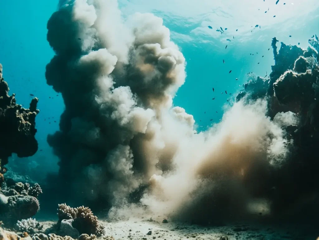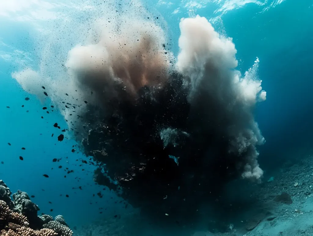And there, in the distance, he saw it: a sudden bloom of light beneath the water, followed by the muffled roar of an explosion. The sea convulsed as the blast rolled through it. A dull, thunderous crack reverberated across the reef, followed by a surge of bubbles and silt exploding upward in a blinding cloud.