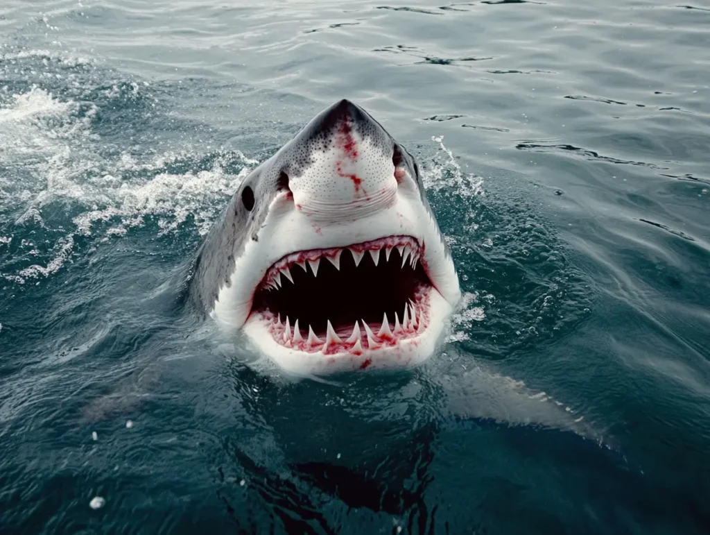 Out of the haze, a colossal shadow surged forward. A great white shark, vast and unstoppable, cut through the water with terrifying speed. Marcus kicked wildly, desperate to break away, but the predator slammed into his side, driving him deeper, forcing him into the endless dark below.