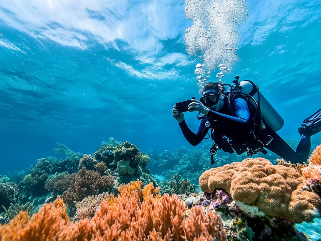 One of us has to bring this boat home.” They slowed near a patch of turquoise, where the reef rose unseen beneath the surface. Marcus pulled his gear into place, tightening straps and checking gauges with practiced ease. His camera hung ready in his grip, the instrument that turned his dives into something more than memory.