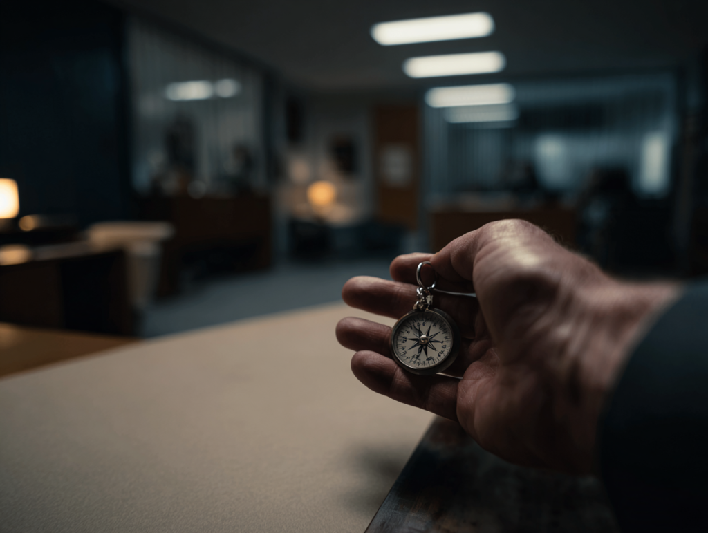 They drove to the station in silence, rain following them like a curtain. In an interview room, Vance set the compass at the center of the table. “Start from when you met him,” he said. Liam stalled a bit. Vance prepared to take notes, not as a father, but as a detective.