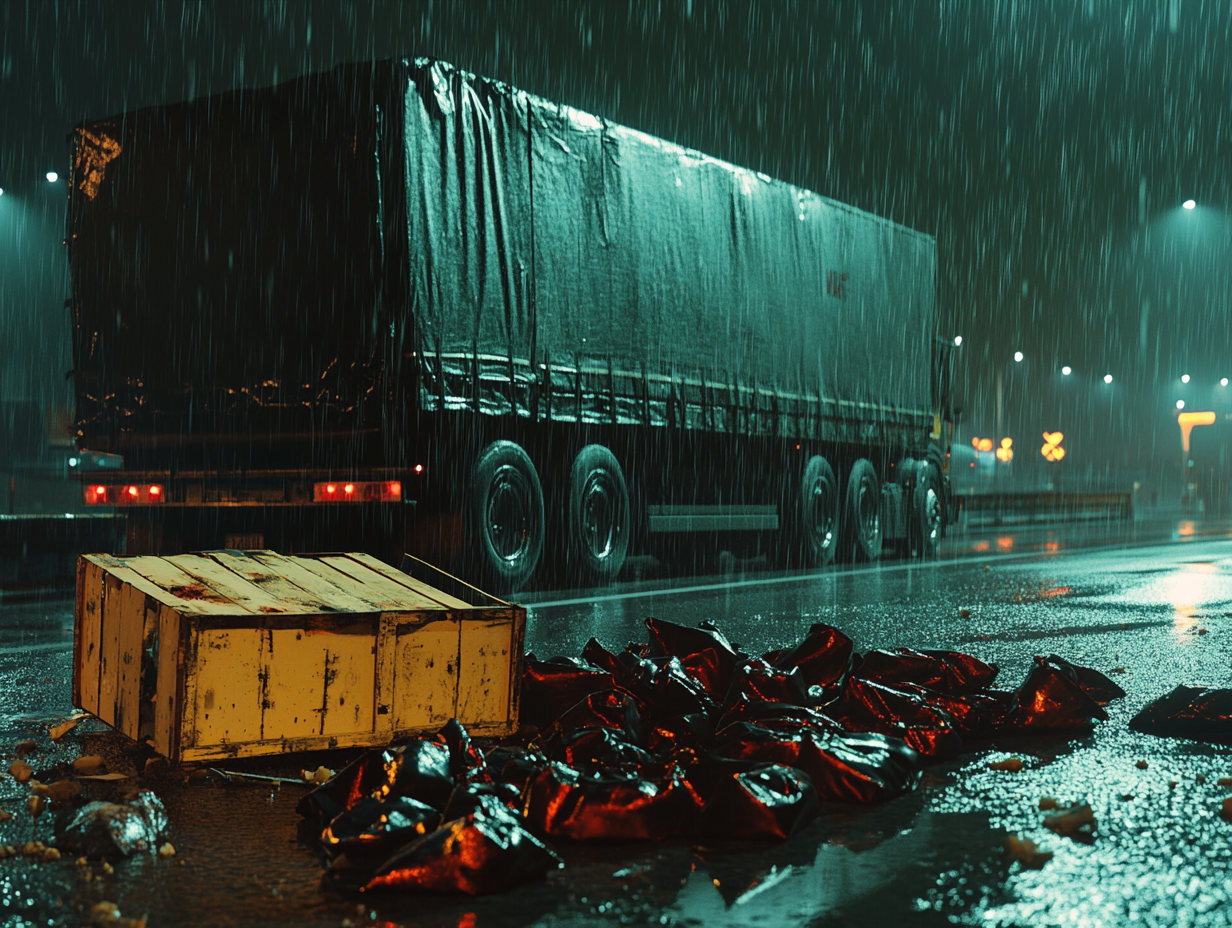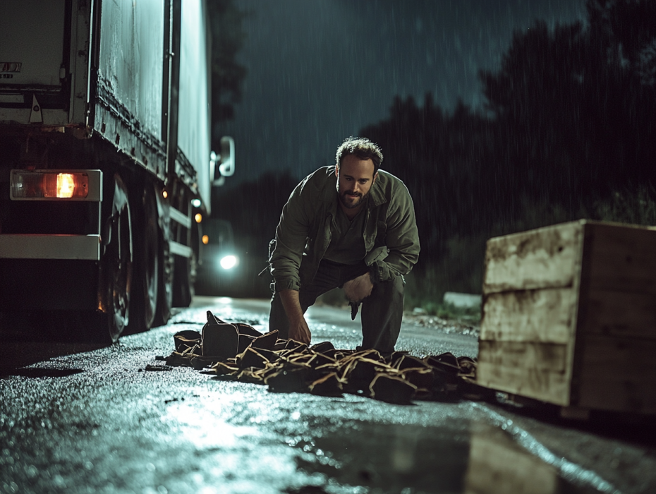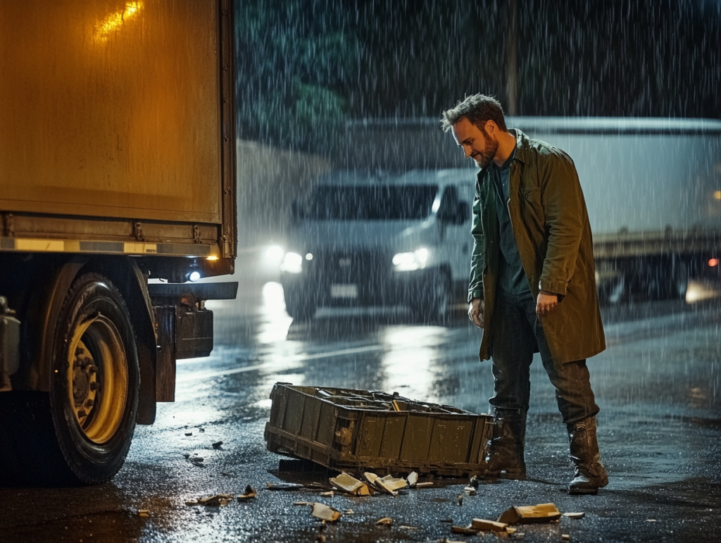 Rain hammered the interstate like it wanted to break through. Dan fought the wheel as the truck fishtailed, the trailer jerking behind him like it had a mind of its own. One hard jolt, a metallic crack, and something inside snapped loose. Crates burst through the back and tumbled out.