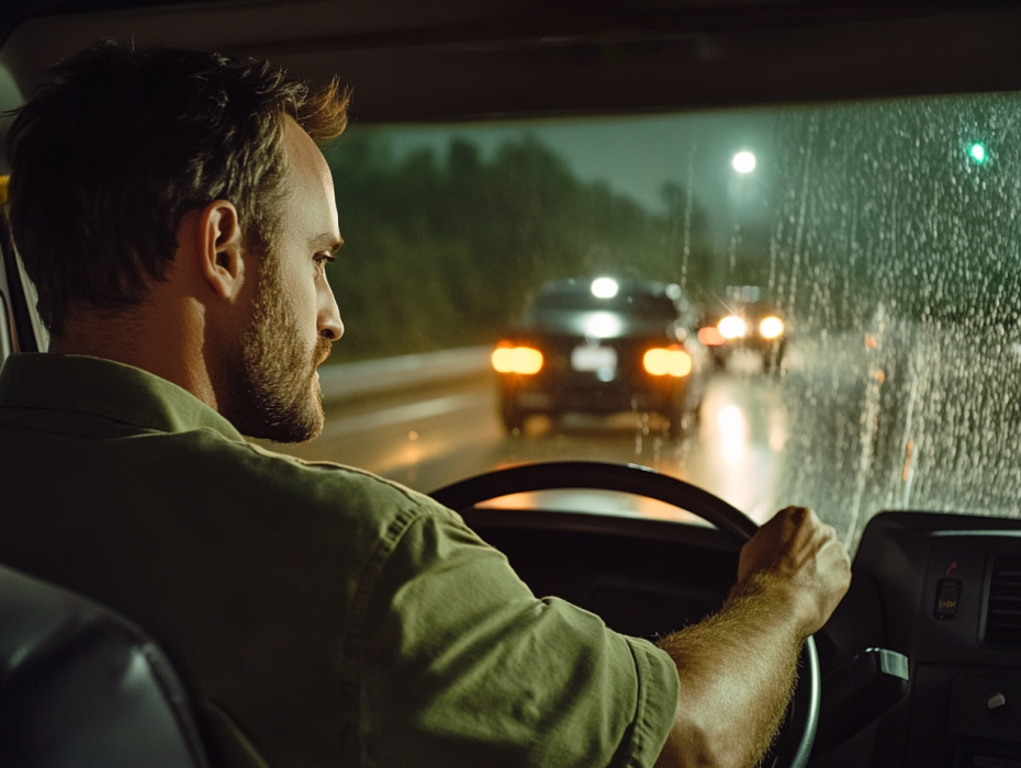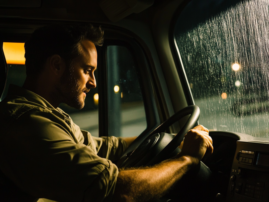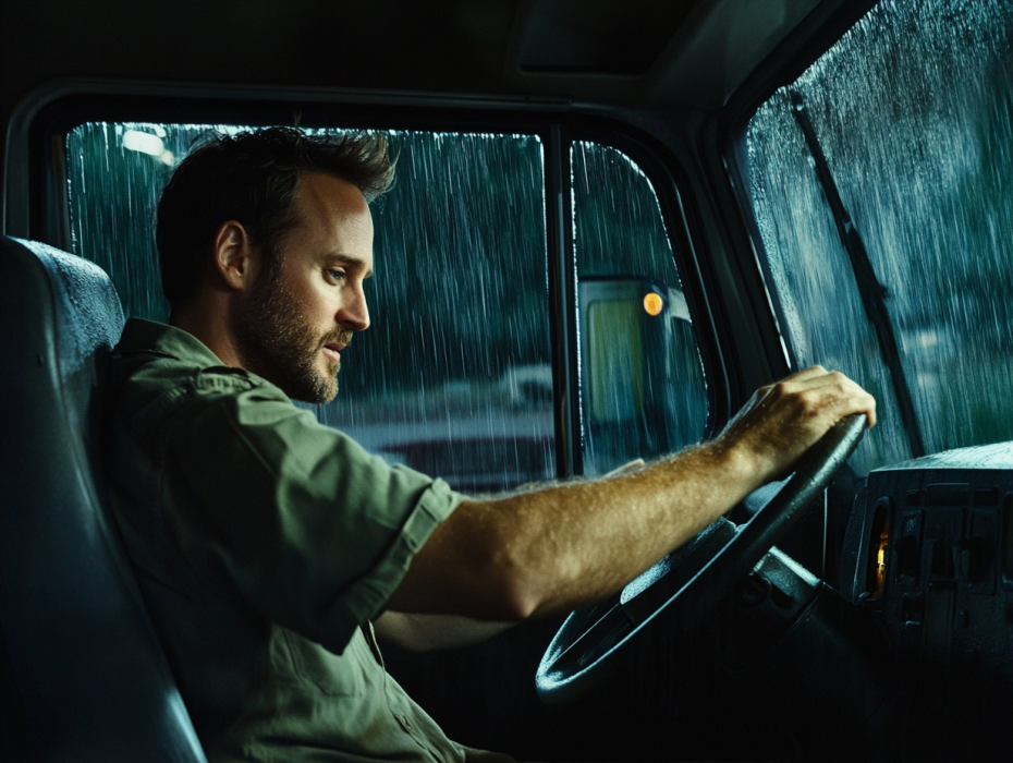 Rain started again the moment he rolled through the gates, fat drops splattering against the windshield. By the time he reached the main road, it was a steady downpour. Wipers groaned across the glass, rhythm matching the engine’s low hum. He muttered, “Great timing,” and kept the rig steady.