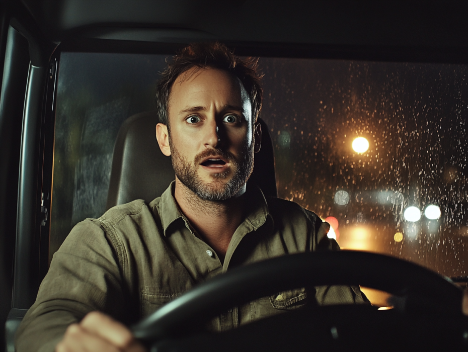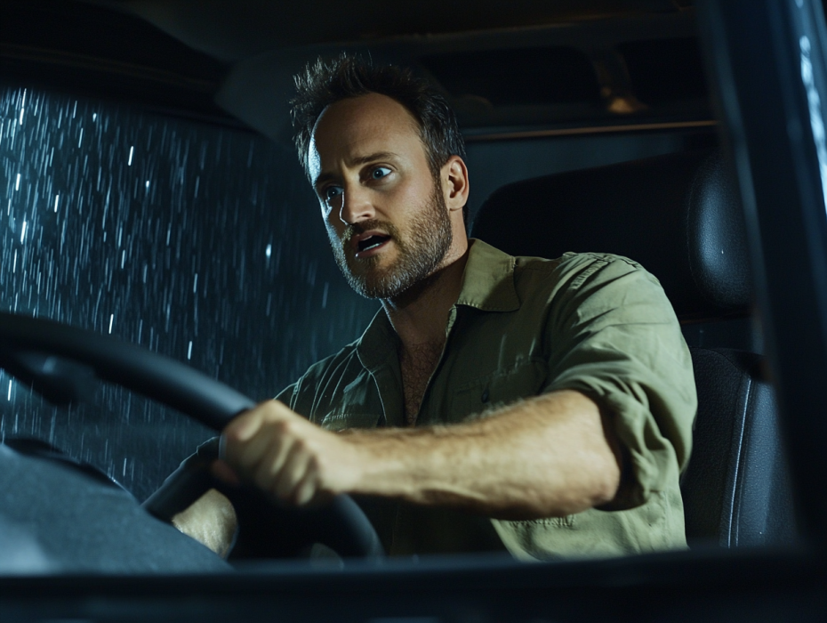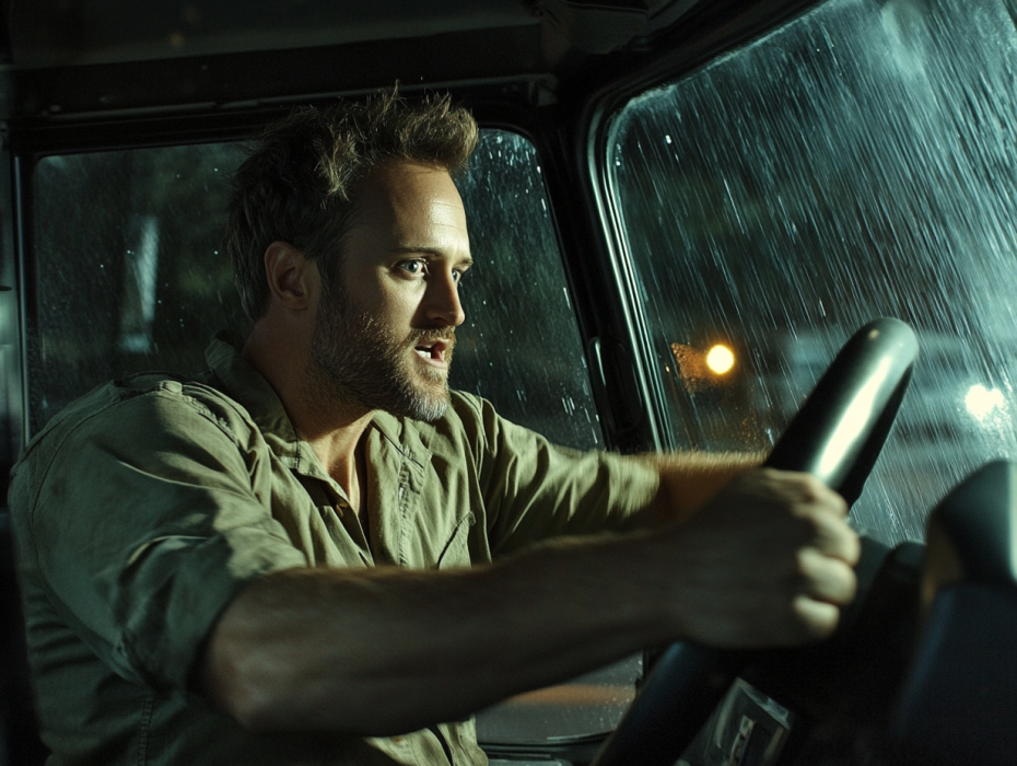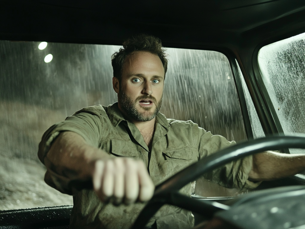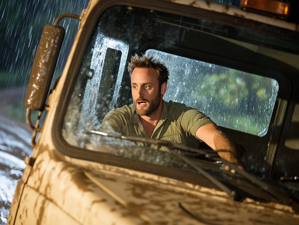 The world turned into chaos with wipers flailing, engine growling, and headlights bouncing through trees. The truck wobbled a bit, back end sliding sideways before catching grip again. Mud splattered across the windshield, blinding him for seconds that felt like minutes. “Come on, come on!” he yelled, fighting the spin.