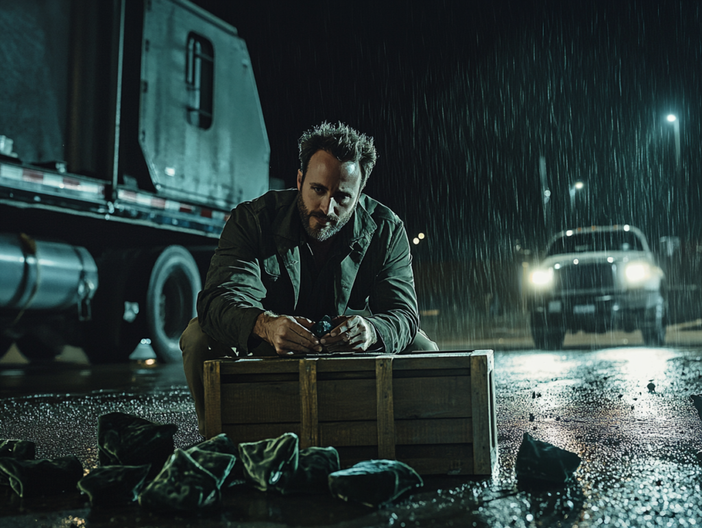 He crouched beside the shattered crate, rain soaking through his jacket. The beam from his flashlight sliced across splintered wood and something dark inside—velvet, not packing paper. His brow furrowed. Furniture wasn’t lined in velvet. He brushed away wet debris, heartbeat thudding louder with each second.