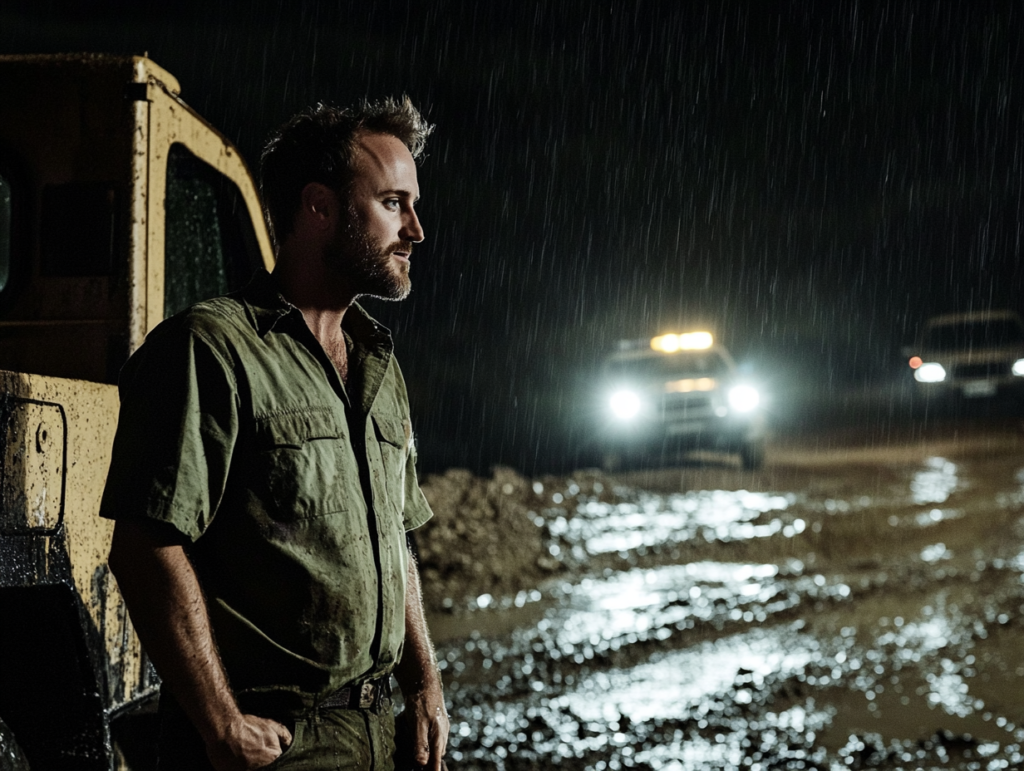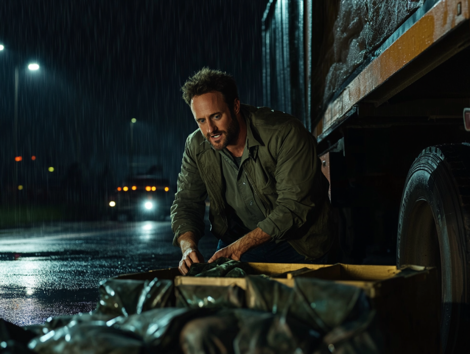 He stepped out into the storm, boots sinking in muddy water as he rounded the trailer. The rain fell so hard it bounced off the metal sides like nails. One of the straps had torn clean through. He grabbed a new one from the toolbox and started re-securing the load.