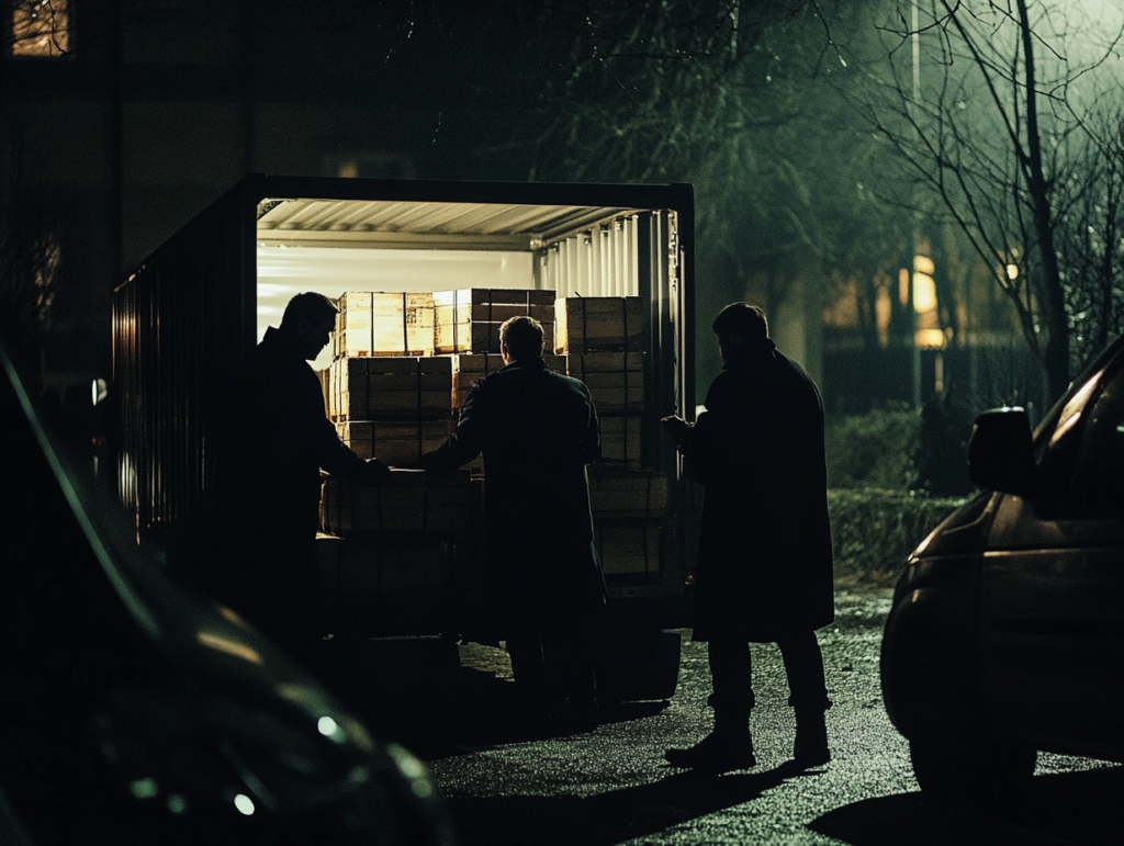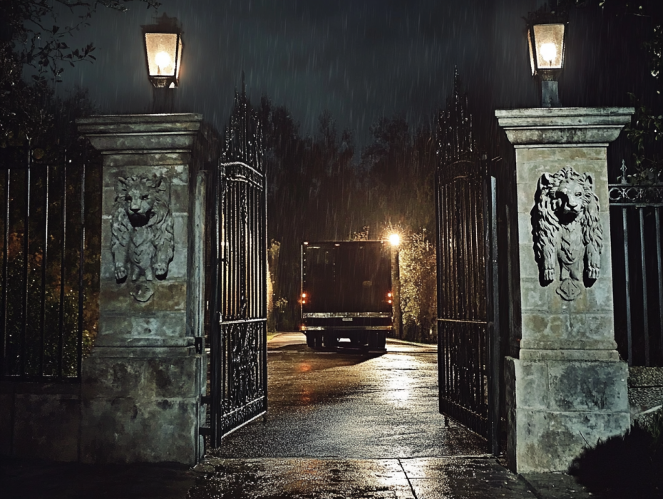 Pickup was at a private estate on the outskirts of town. Dan noticed iron gates, stone lions, and a driveway long enough to lose sight of the main road. Floodlights glared through the mist as Dan rolled up to the loading bay. He expected movers, but instead, there were silent men in suits.