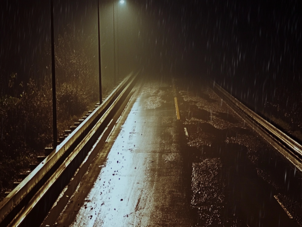 There weren’t any. It was just black forest on both sides and a river of rain ahead. The wipers thrashed uselessly, barely keeping up. His shoulders ached from gripping the wheel. He scanned for exits, rest stops, lights, or anything human, but the world had shrunk to asphalt and fear.